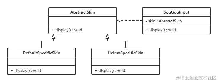 分析:搜狗输入法 的皮肤是输入法背景图片、窗口颜色和声音等元素的组合。用户可以根据自己的喜爱更换自己的输入法的皮肤,也可以从网上下载新的皮肤。这些皮肤有共同的特点,可以为其定义一个抽象类(AbstractSkin),而每个具体的皮肤(DefaultSpecificSkin和HeimaSpecificSkin)是其子类。用户窗体可以根据需要选择或者增加新的主题,而不需要修改原代码,所以它是满足开闭原则的。