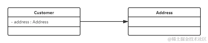 在UML类图中单向关联用一个带箭头的实线表示。上图表示每个顾客都有一个地址,这通过让Customer类持有一个类型为Address的成员变量类实现。