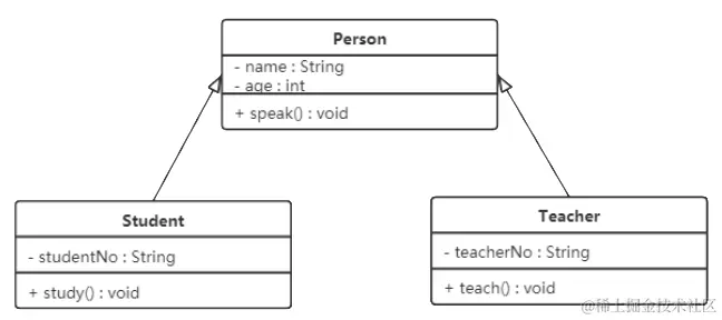 在 UML 类图中,泛化关系用带空心三角箭头的实线来表示,箭头从子类指向父类。在代码实现时,使用面向对象的继承机制来实现泛化关系。例如,Student 类和 Teacher 类都是 Person 类的子类,其类图如下图所示: