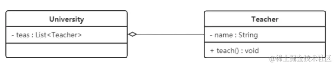 在 UML 类图中,聚合关系可以用带空心菱形的实线来表示,菱形指向整体。下图所示是大学和教师的关系图: