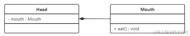 在 UML 类图中,组合关系用带实心菱形的实线来表示,菱形指向整体。下图所示是头和嘴的关系图: