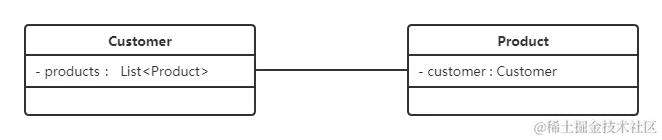 在UML类图中,双向关联用一个不带箭头的直线表示。上图中在Customer类中维护一个List<Product>,表示一个顾客可以购买多个商品;在Product类中维护一个Customer类型的成员变量表示这个产品被哪个顾客所购买。