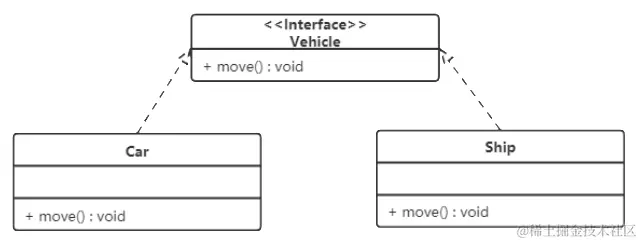 在 UML 类图中,实现关系使用带空心三角箭头的虚线来表示,箭头从实现类指向接口。例如,汽车和船实现了交通工具,其类图如图 9 所示。