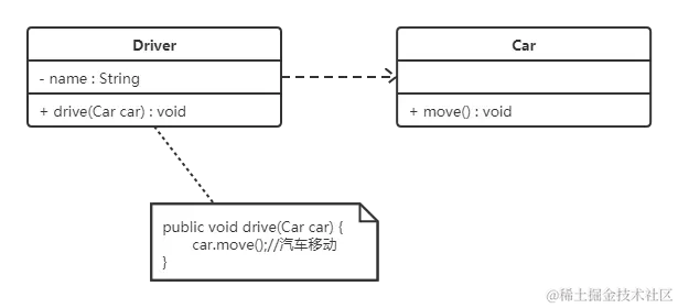 在 UML 类图中,依赖关系使用带箭头的虚线来表示,箭头从使用类指向被依赖的类。下图所示是司机和汽车的关系图,司机驾驶汽车: