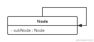自关联在UML类图中用一个带有箭头且指向自身的线表示。上图的意思就是Node类包含类型为Node的成员变量,也就是“自己包含自己”。