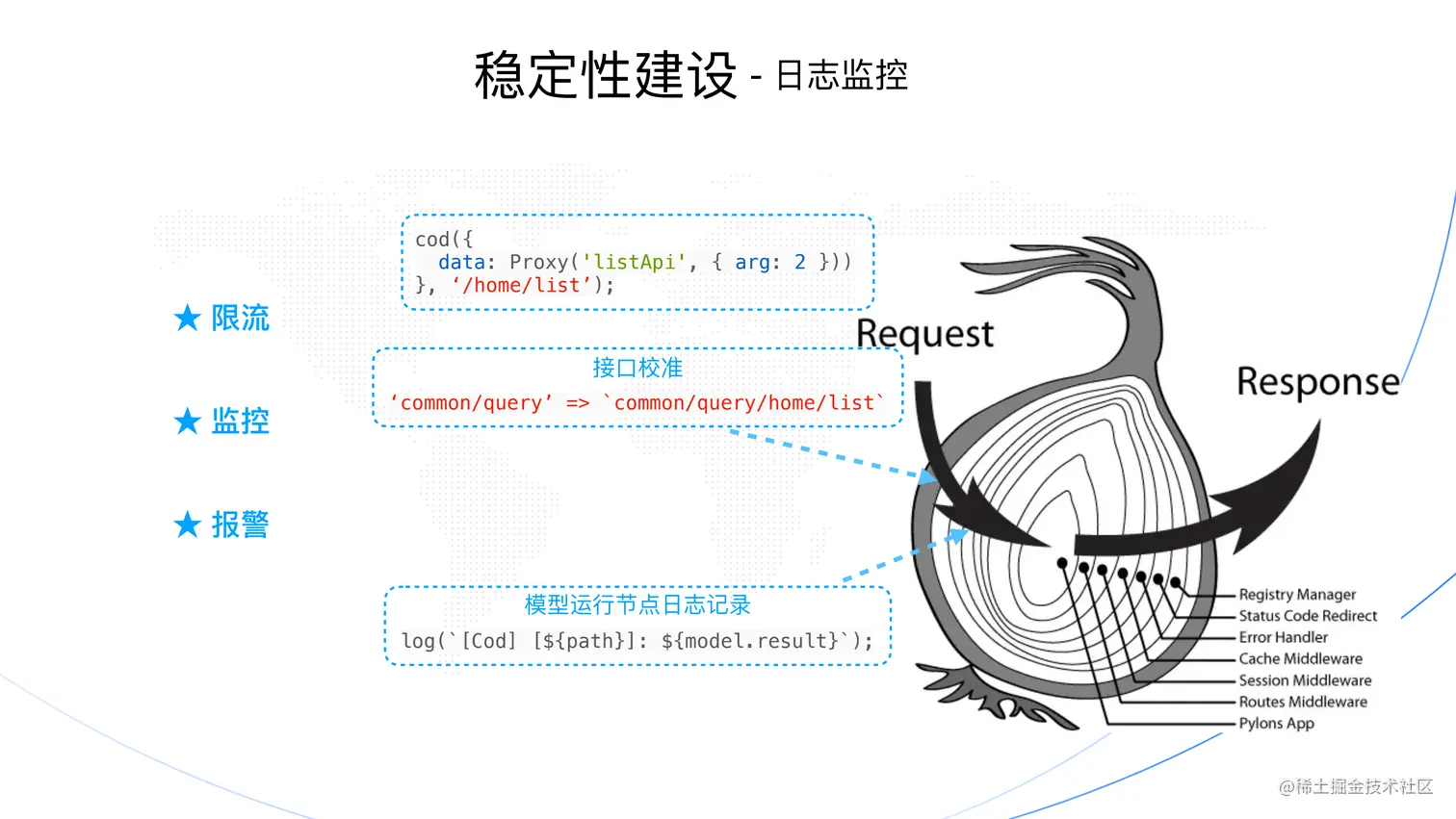 Egg.js 是基于 Koa 的洋葱模型,右边这种图就示意了一下我们做工作。所有除了编排的语法之外,在调用通用接口中,我们还会传入其实际要表达 Controller 名称。然后在洋葱的最外层进行接口的校准。让它在后续的处理中都变成一个独立的 Controller 进行限流和监控。同时我们也定义了标准的 Cod 运行时日志格式。通过日志的过滤对所有的 Cod 编排接口进行统一监控。