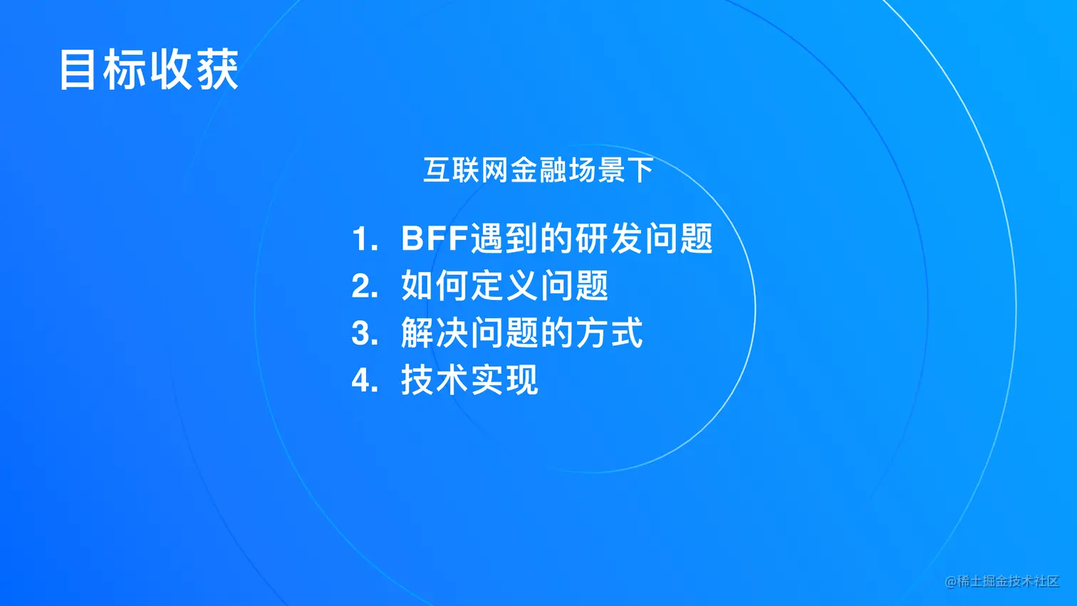 通过这次分享,想和大家聊聊在互联网金融场景下的 BFF 开发中我们所遇到的痛点。然后我们是如何去怎么定义这些问题,然后一路摸索慢慢解决的。同时也会分享一下其中的技术实现。最后希望能给大家带来一些启发,在自己的业务中如何去设计低码的方案。
