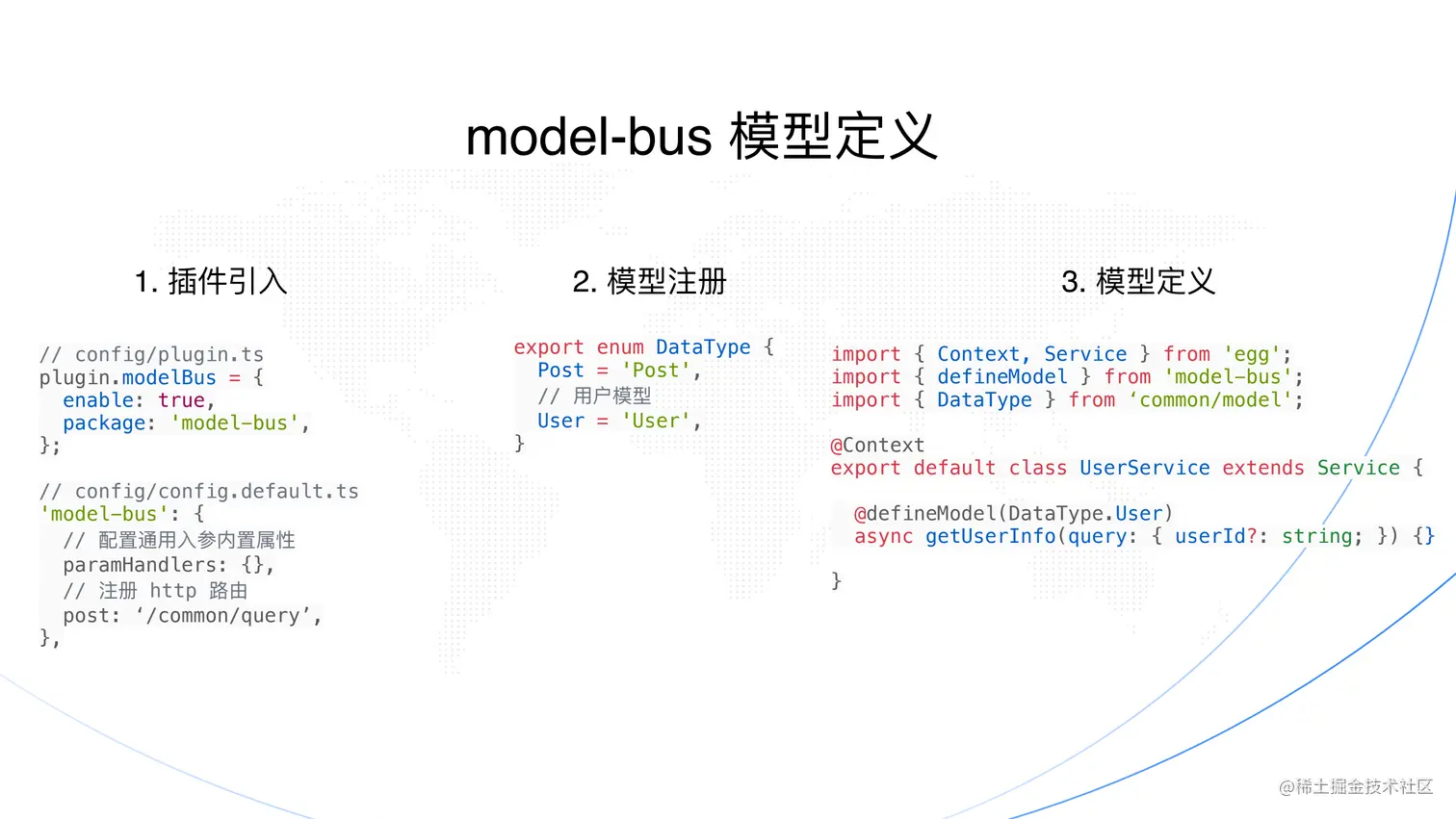 我们看一下 model-bus 的使用方式,model-bus 是基于 Egg.js 的,只需要在 plugin 中开启 model-bus 的插件,然后注册 CodQL 的通用接口,例如 POST 接口 common/query,也可以配置些需要处理的前置方法和入参的处理。然后进行模型注册,也就是个枚举,没有其他特别的作用,只是为了方便管理。最后就在需要定义模型 service 方法上添加上装饰器就可以了。例如这个 User,后续只要在前端声明我要这个 User 模型,就可以执行返回了。