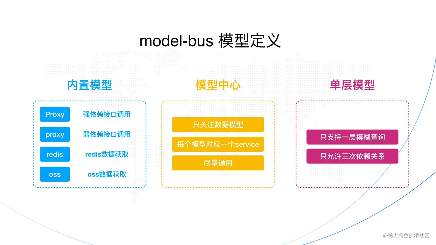 model-bus 的模型中心,在 model-bus 的模式中,我们关注的是数据模型,前端通过 CodQL,也就是类 GraphQL 的语句来查询需要的数据模型。每个模型对应 BFF 的一个 Service 方法,模型本身的数据字段是丰富的,在客户端我们通过 CodQL 来选择和转换需要的数据字段,这样就能够做到数据适量和功能丰富之间的平衡。同时作为一个数据模型,应该尽量通用,而不是尽量接近页面模型。例如,模型中字段的 format 操作应该在客户端,而不是在 model-bus 的模型上的。