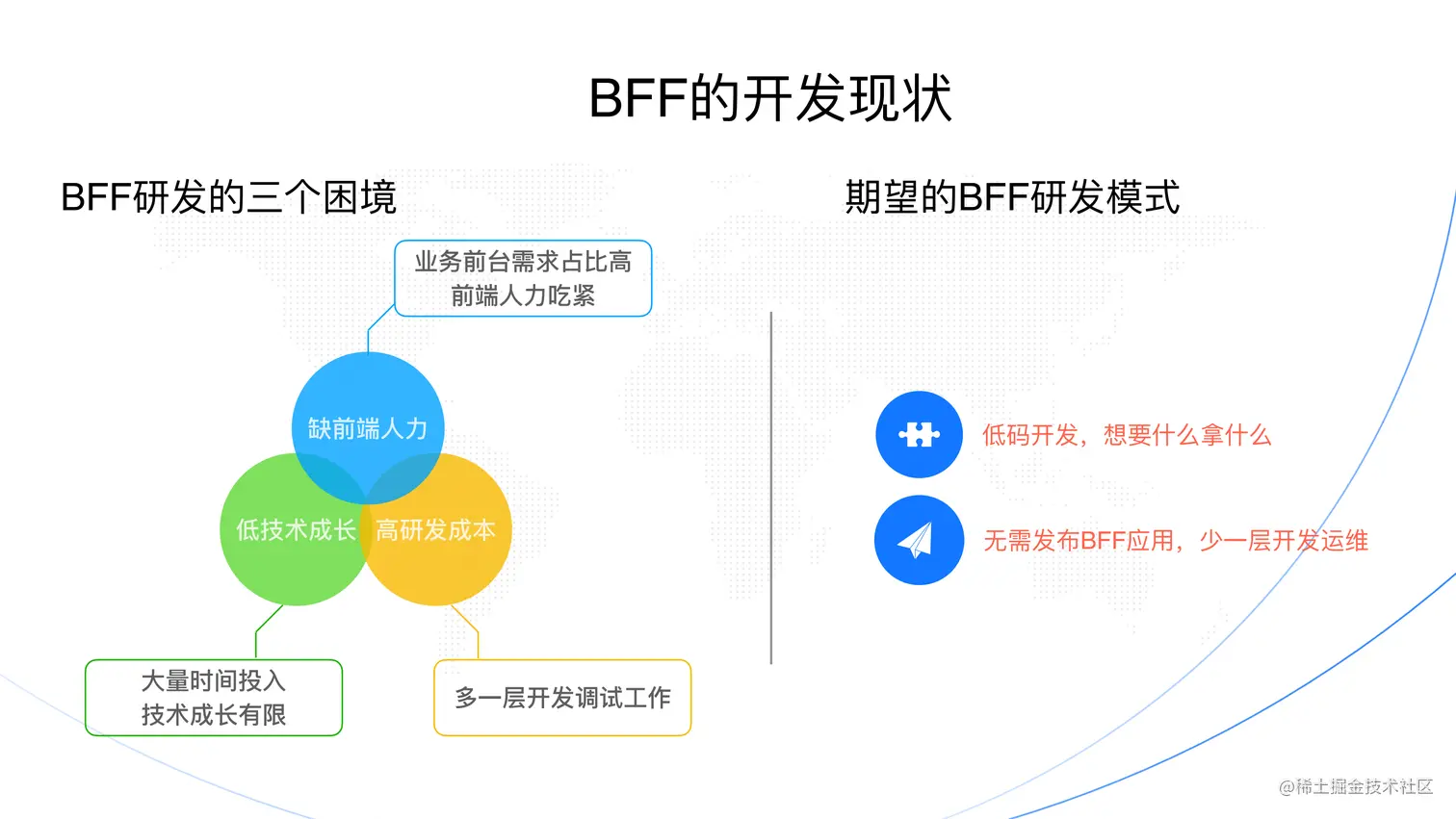 - 人力吃紧,大家应该都有体会前端开发是真的难招,然后业务发展往往前端的需求占大头,与此同时还要开发 BFF,也就造成了前端人力的短缺。
