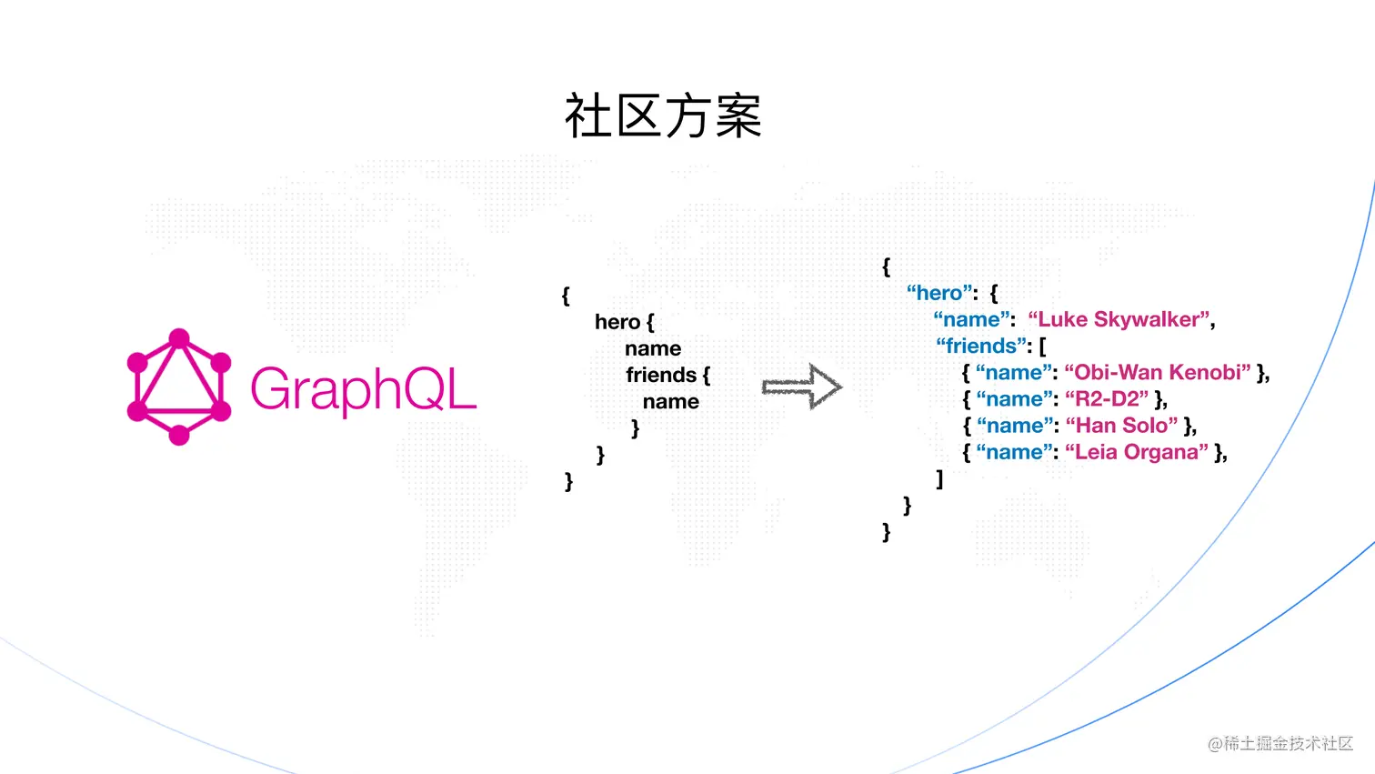 前面说到,前端想要什么就拿什么,那么第一反应就是 GraphQL 声明式的开发方式。一个通用接口,传入所需要的内容,接口就可以返回对应的数据。不需要每个页面都去开发一个接口。一个 GraphQL 的接口就能够走天下了。我截取了 GraphQL 官网上的调用示例,就很灵活快捷。