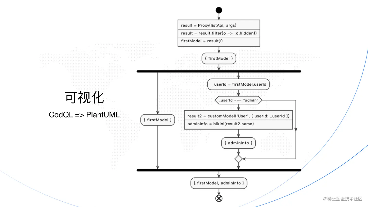 同时我们也发现可视化是有价值的,能够让我们直接看到逻辑过程,也能够验证编排代码是否有问题。所以我们也做了编排可视化的支持。可以自动的把 CodQL 的语法转换为 UML 的流程图。例如上面那个例子,生成的图就是这样的。在做一些需求的系统分析时,便也可以通过 CodQL 来描述逻辑然后生成图片示意在文档中。