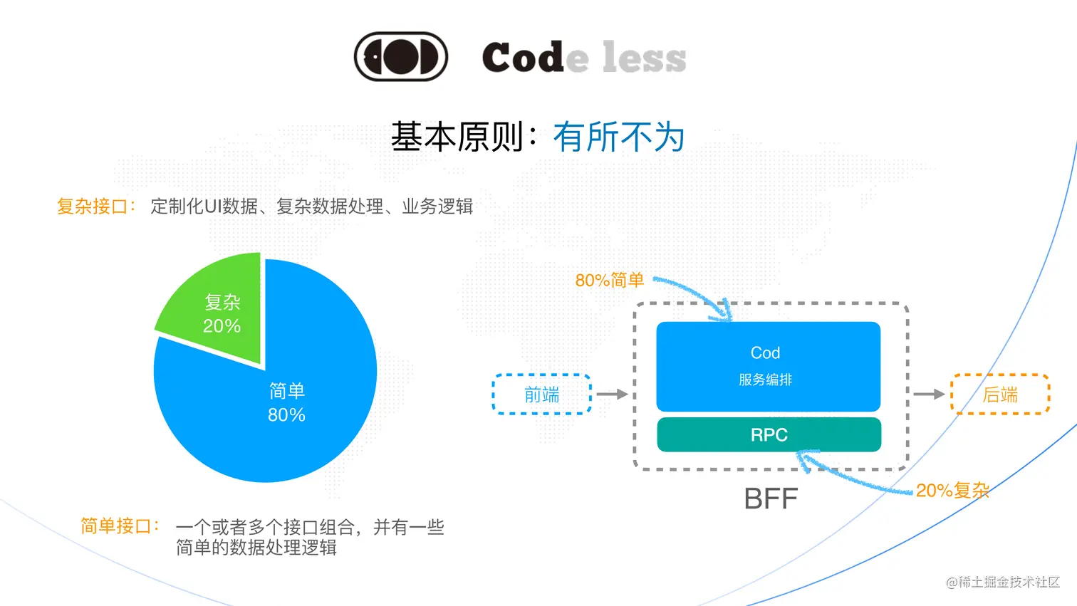 我们先看左边的一张图,在我们的业务场景下,BFF 中 80% 的接口都是简单的接口,我们对于简单接口的定义是:一个或多个接口组合,并有一些简单的数据处理逻辑。还有 20% 是复杂的接口,就是有需要定制化的 UI 逻辑和复杂的数据处理逻辑。