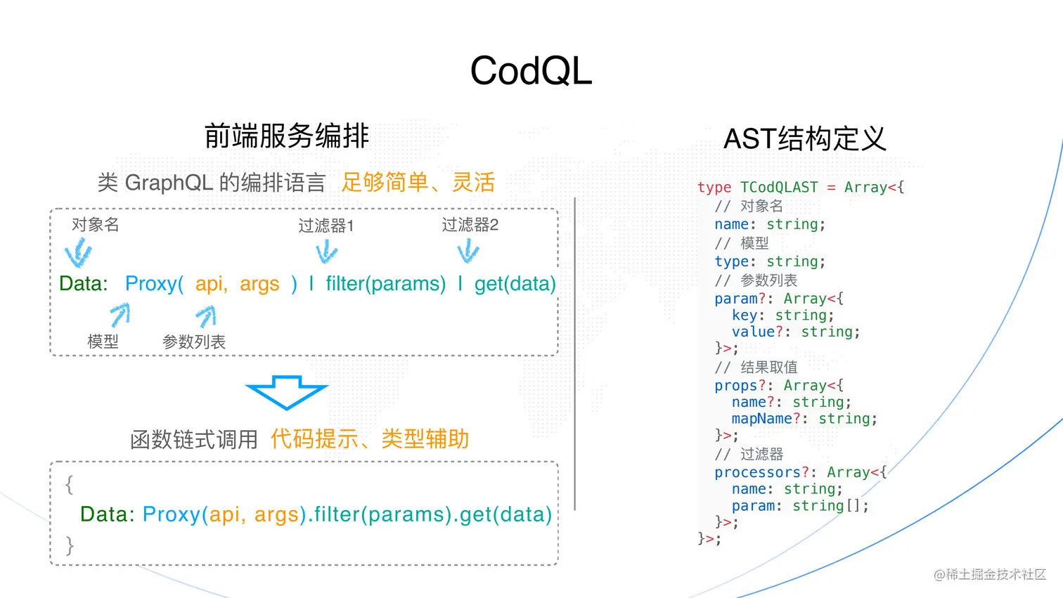 介绍完 BFF 端的执行插件,向大家介绍一下前端的编排语法 CodQL,一开始我们是借鉴 GraphQL 设计的编排语言,大家可以看一下,就是一个字符串的入参。先是 Data 对象名,后面的语句运行完便赋值给 Data,然后返回给前端。后面 Proxy 就是模型,然后传入参数,在后面便是过滤器,filter() 和 get(),根据前面 API 接口返回值进行二次加工。当然过滤器是支持使用的同学自定义拓展的,还可以进行金额的标准化、脱敏等等操作。