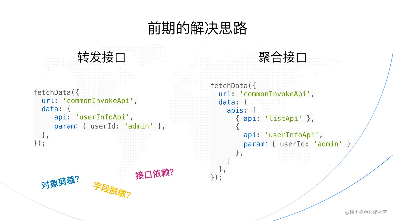 我们的前期的解决思路就比较简单,在我们的业务开发中,部分 BFF 接口就只是转发下参数,我们不希望为了一个转发的接口就去开发一个接口然后发布 BFF,还需要补充单测等等。投入产出不成正比。于是我们就开发了一个通用的转发接口 commonInvoke,把需要转发的后端接口名称和参数都作为参数传入,然后 commonInvoke 根据入参来调用不同的后端接口。这样就不需要额外写接口了。那么需要聚合数据时,就传个后端接口的数组,通过通用的处理聚合逻辑。但是在互联网金融的业务场景下,往往需要身份证脱敏,敏感字段裁剪,这又该怎么办?有些有逻辑依赖的接口又该怎么办呢?
