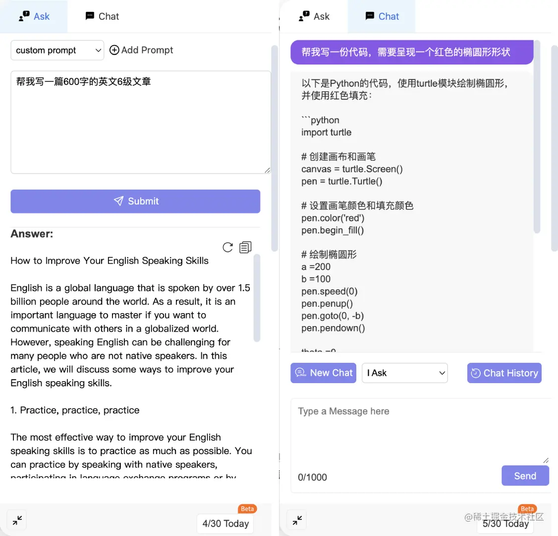 - 输入文案或选中网页内容,选择模版或者自定义问题,提交生成