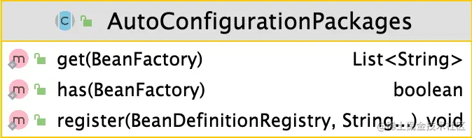 因为方法比较简单,所以直接说结论:has是判断basePackages是否存在且不为空,get是获取basePackages。终于恍然大悟,原来AutoConfigurationPackage的意义就在于对外提供这个basePackages。比如在SpringBoot Mybatis中,就调用了get方法获取basePackages,具体调用位置参考:org.mybatis.spring.boot.autoconfigure.MybatisAutoConfiguration.AutoConfiguredMapperScannerRegistrar#registerBeanDefinitions
