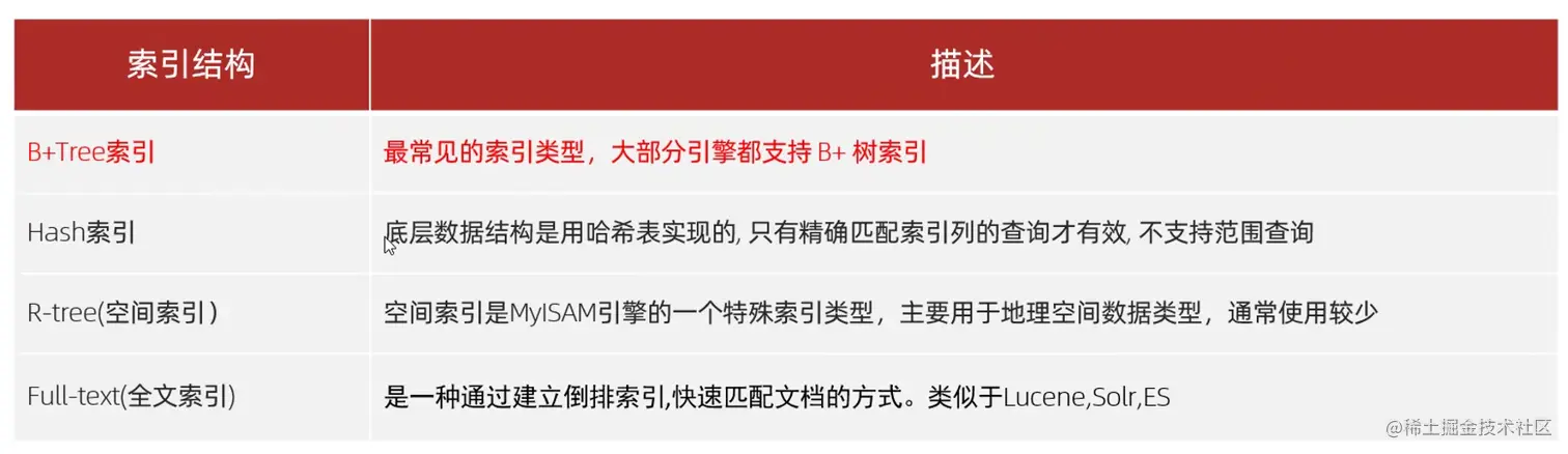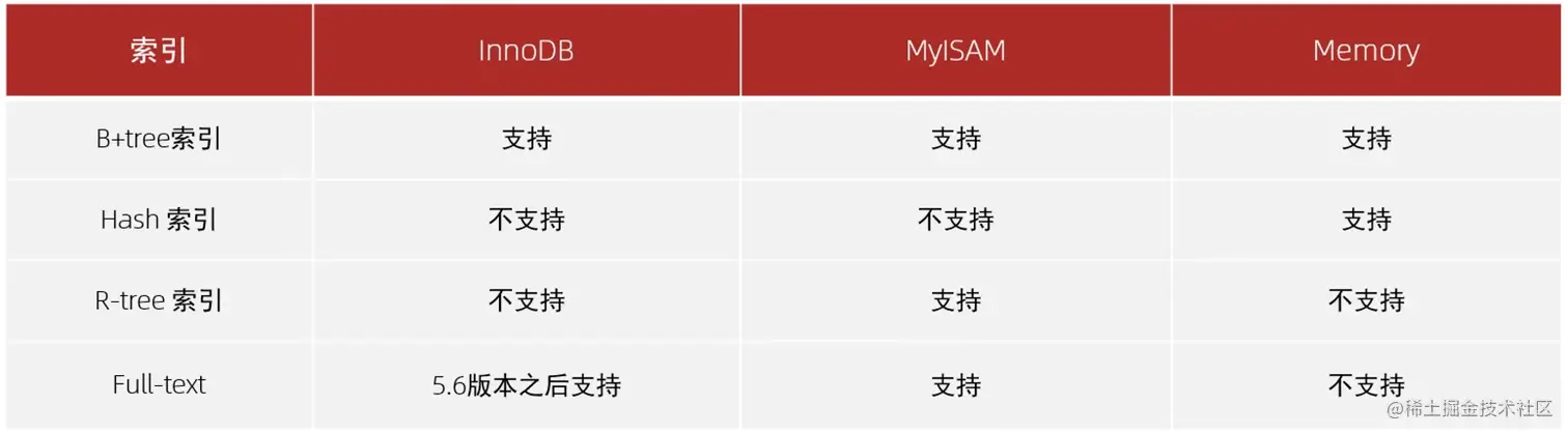 MySQL的索引是在存储引擎层实现的(InnoDB、MyISAM、Memory)。不同的存储引擎有着不同的索引结构,如下