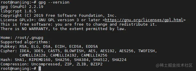 安装完成后,可以使用以下命令来验证 GPG 是否已成功安装:
