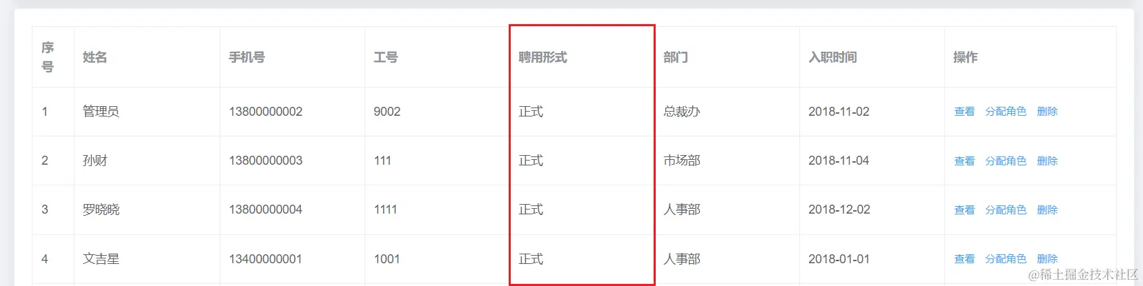 <el-table border :data="employeesList"> <el-table-column label="序号" type="index" /> <el-table-column label="姓名" prop="username" /> <el-table-column label="头像" prop="staffPhoto" /> <el-table-column label="手机号" prop="mobile" /> <el-table-column label="工号" prop="workNumber" /> <el-table-column label="聘用形式" prop="formOfEmployment" /> <el-table-column label="部门" prop="departmentName" /> <el-table-column label="入职时间" prop="timeOfEntry" /> <el-table-column label="操作" width="280"> <template> <el-button type="text" size="small">查看</el-button> <el-button type="text" size="small">分配角色</el-button> <el-button type="text" size="small">删除</el-button> </template> </el-table-column> </el-table> -