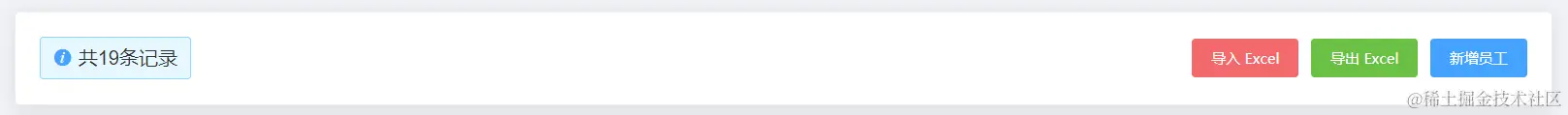 <template> <div class="employees-container"> <div class="app-container"> <!-- 通用工具栏组件使用 --> <page-tools> <!-- 自定义左侧内容 --> <template #slot-left> <span>共 19 条记录</span> </template> <!-- 自定义右侧内容 --> <template #slot-right> <el-button type="danger" size="small">导入excel</el-button> <el-button type="success" size="small">导出excel</el-button> <el-button type="primary" size="small">新增员工</el-button> </template> </page-tools> </div> </div> </template> <script> // 导入组件 import PageTools from '@/components/PageTools' export default { components: { PageTools // 导入自定义组件 } } </script> <style lang="scss" scoped></style>