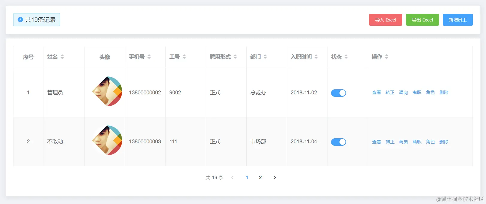 src/employees/employees.vue中引入上边定义的方法并调用created() { // 调用获取员工列表的方法 this.getEmployeeList() }, methods: { // 获取员工列表 async getEmployeeList() { // 调用获取员工列表的 API const res = await getEmployeeListAPI(this.query) console.log(res) // 根据返回的状态码给用户提示 if (!res.success) return this.$message.error(res.message) // 将返回的结果赋值 data 中的数据 this.employeesList = res.data.rows this.total = res.data.total } }