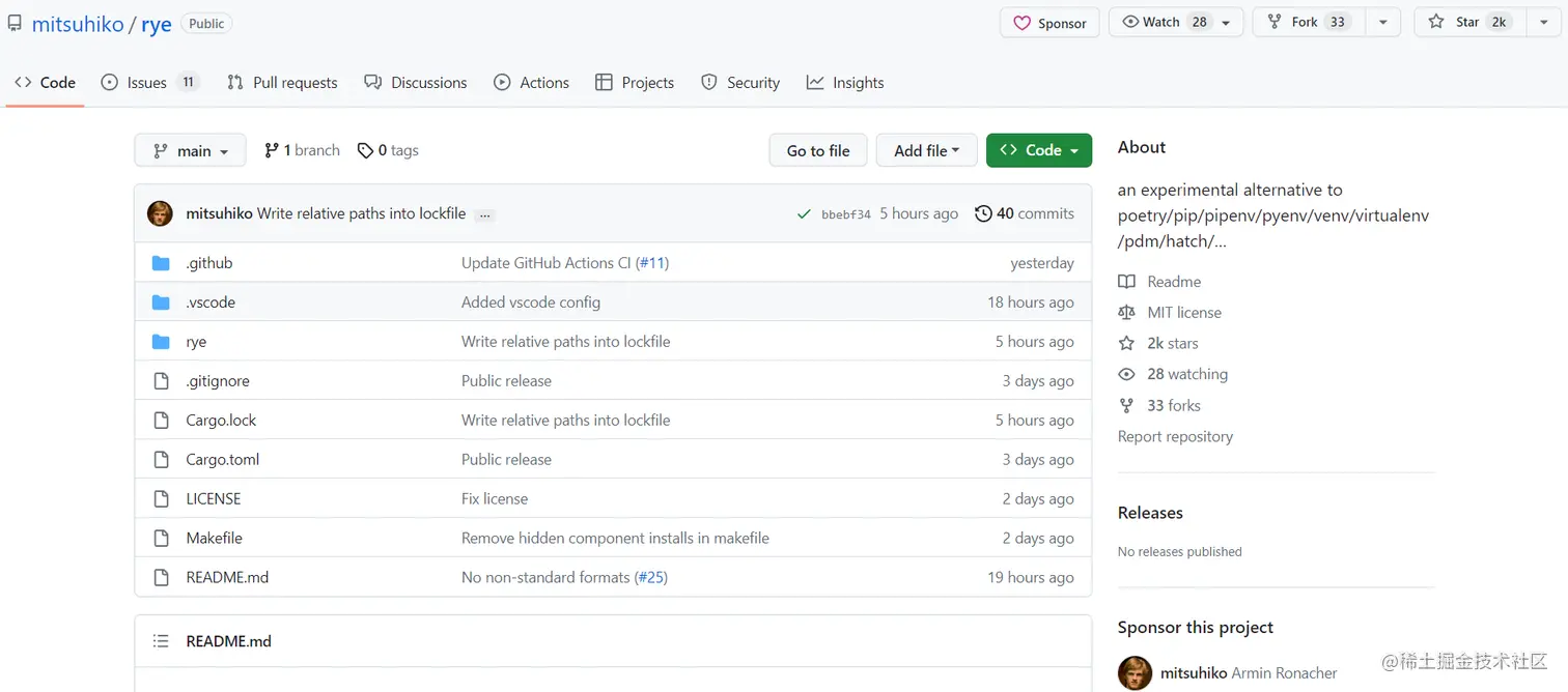 Python Web 框架 Flask 作者 Armin 近日发布了新的开源项目 Rye。这是一款采用 Rust 编写的 Python 包管理工具,Armin 称其可作为 poetry/pip/pipenv/pyenv/venv/virtualenv/pdm/hatch 等同类工具的替代方案。