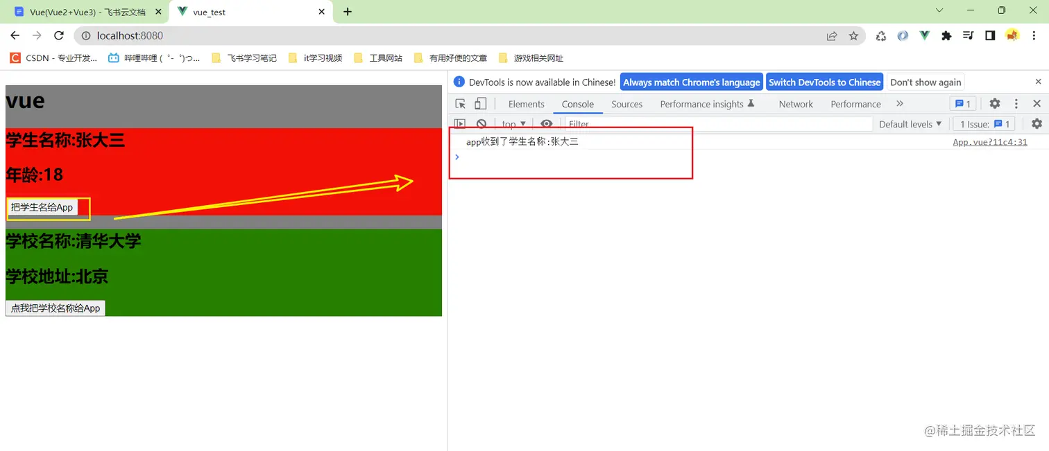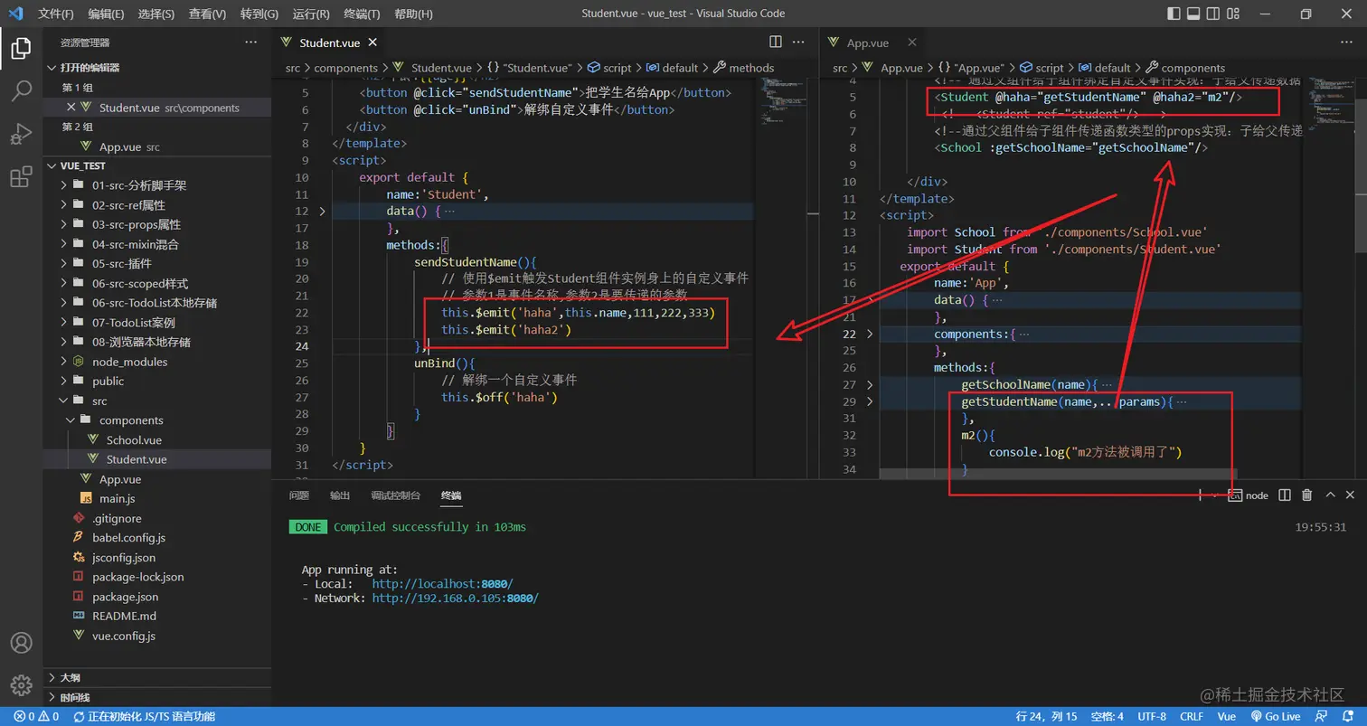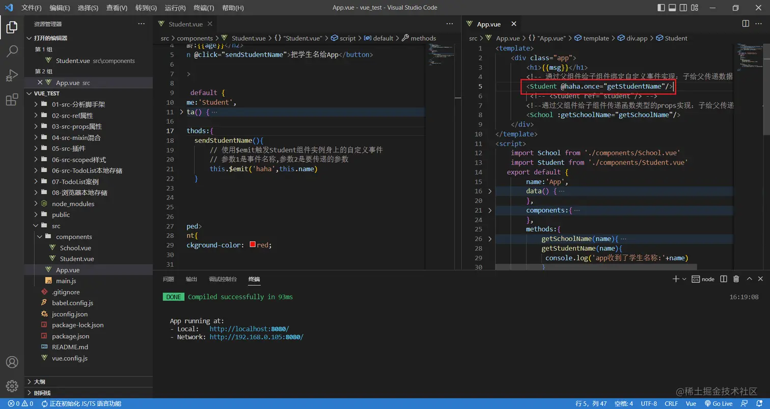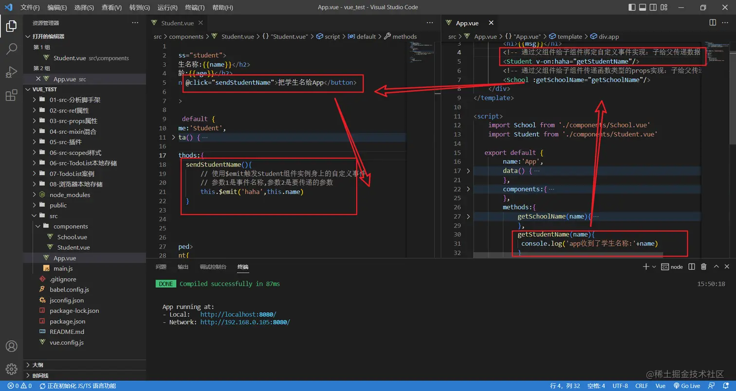 如果我还想继续给student一个按钮,点击的时候把学生姓名给app组件呢?这次不用props了,使用自定义事件实现