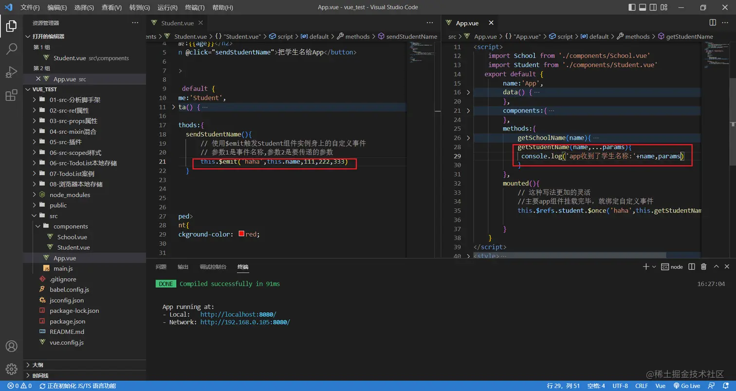自定义事件也是可以支持传递多个参数的,使用逗号拼接即可