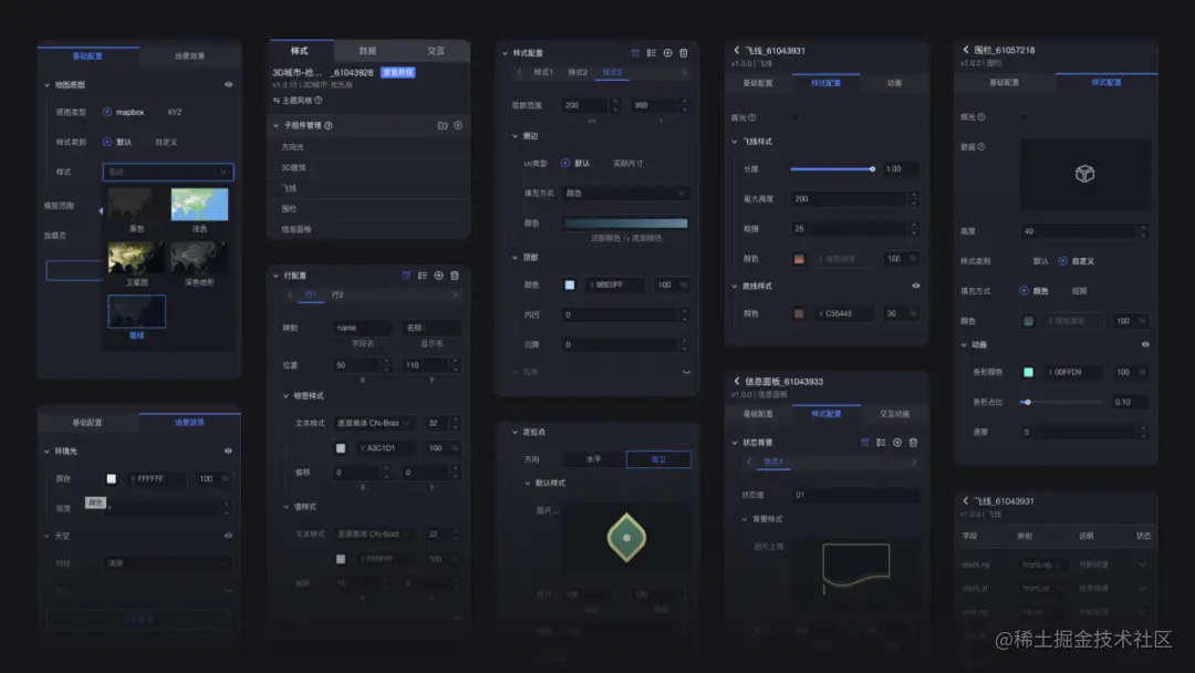 **step4:**进入编辑页后,就可以随心调整各种丰富的参数了,比如,选择不同风格的瓦片地图,调整环境光、天光等获得阴影效果,调整3D建筑的颜色和贴图、飞线的动画快慢...