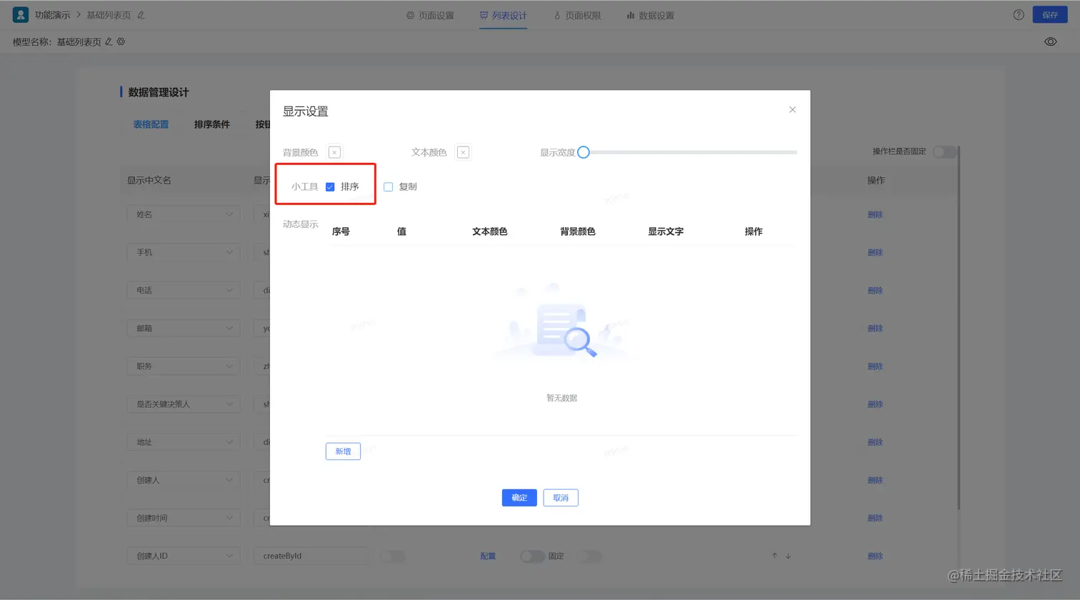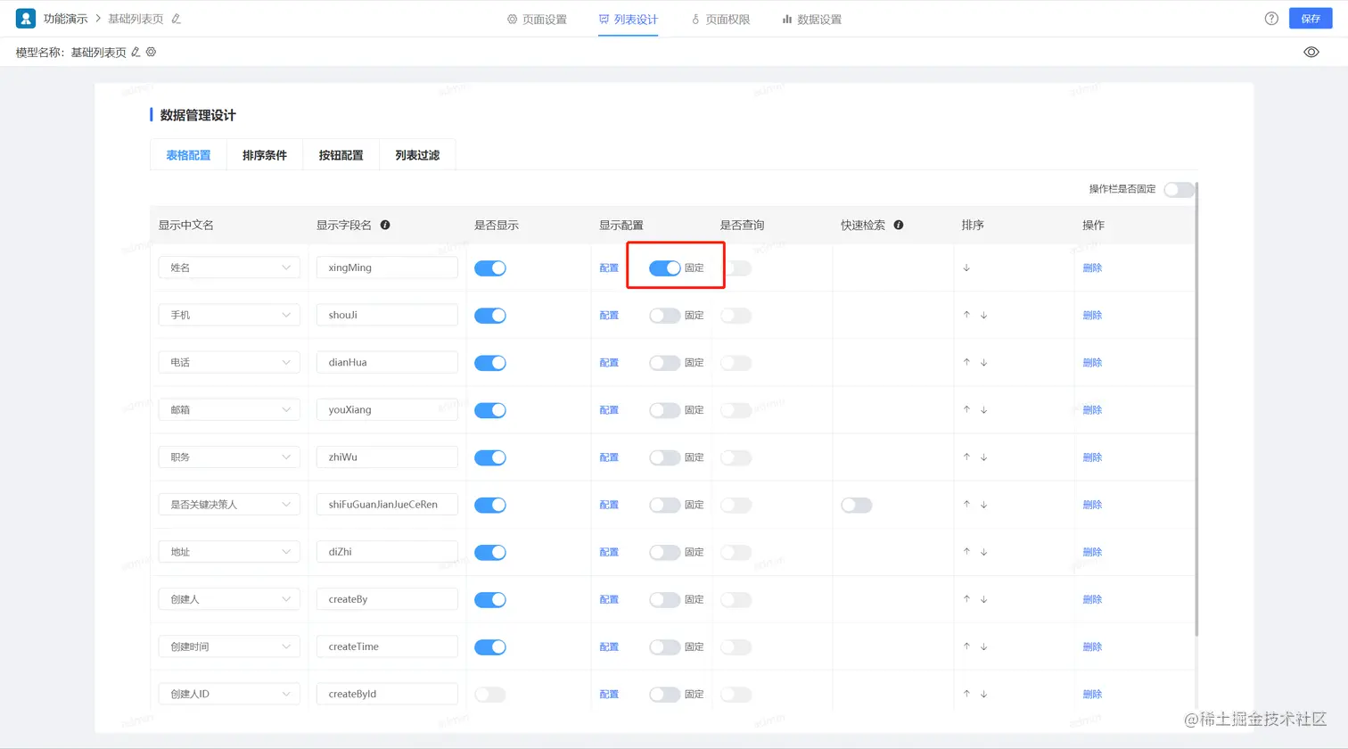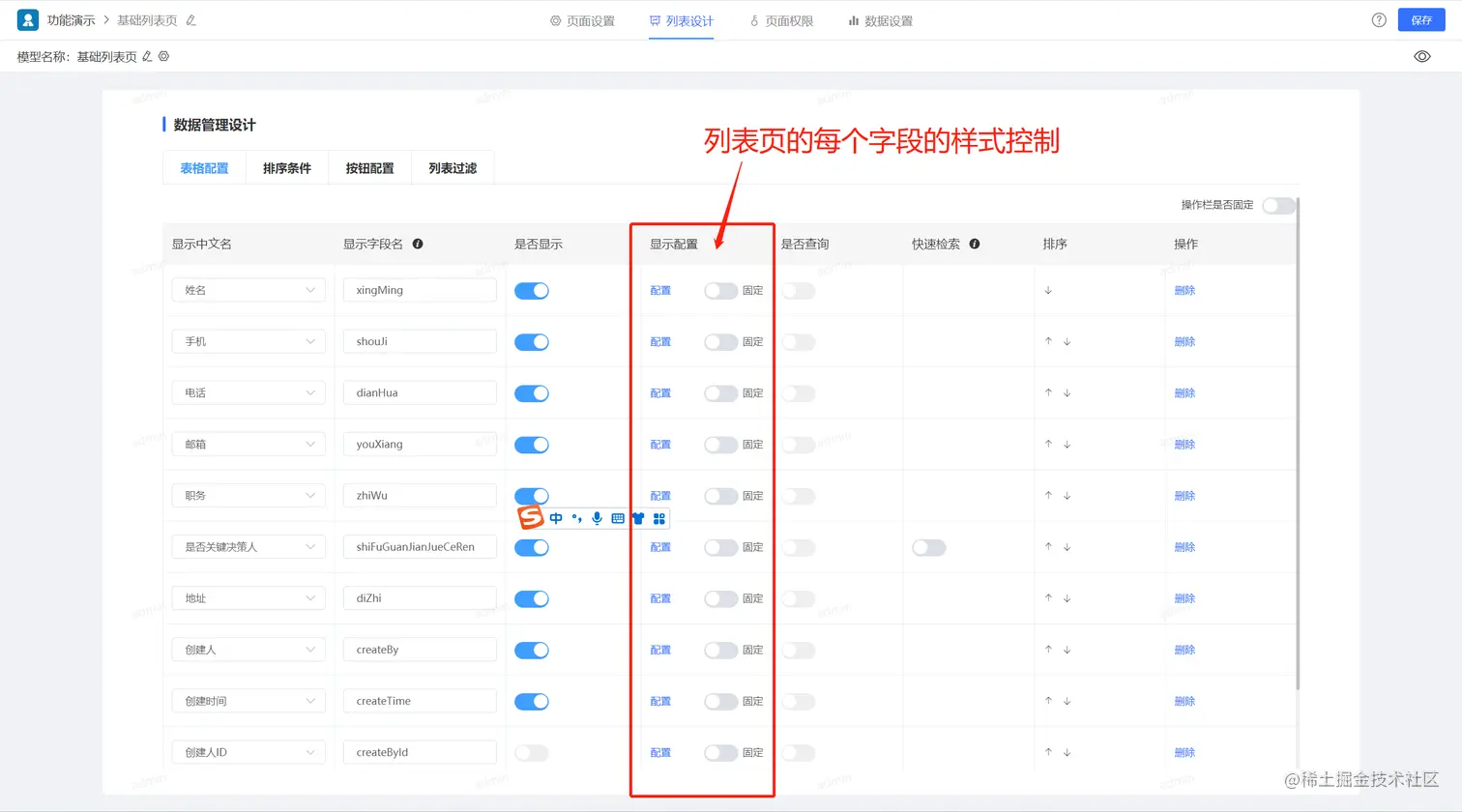 进入列表页的 数据配置界面,每个字段可以有独立的配置效果