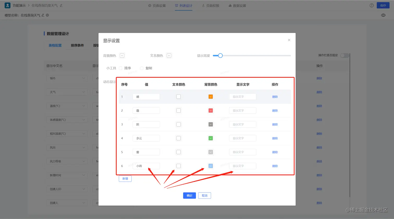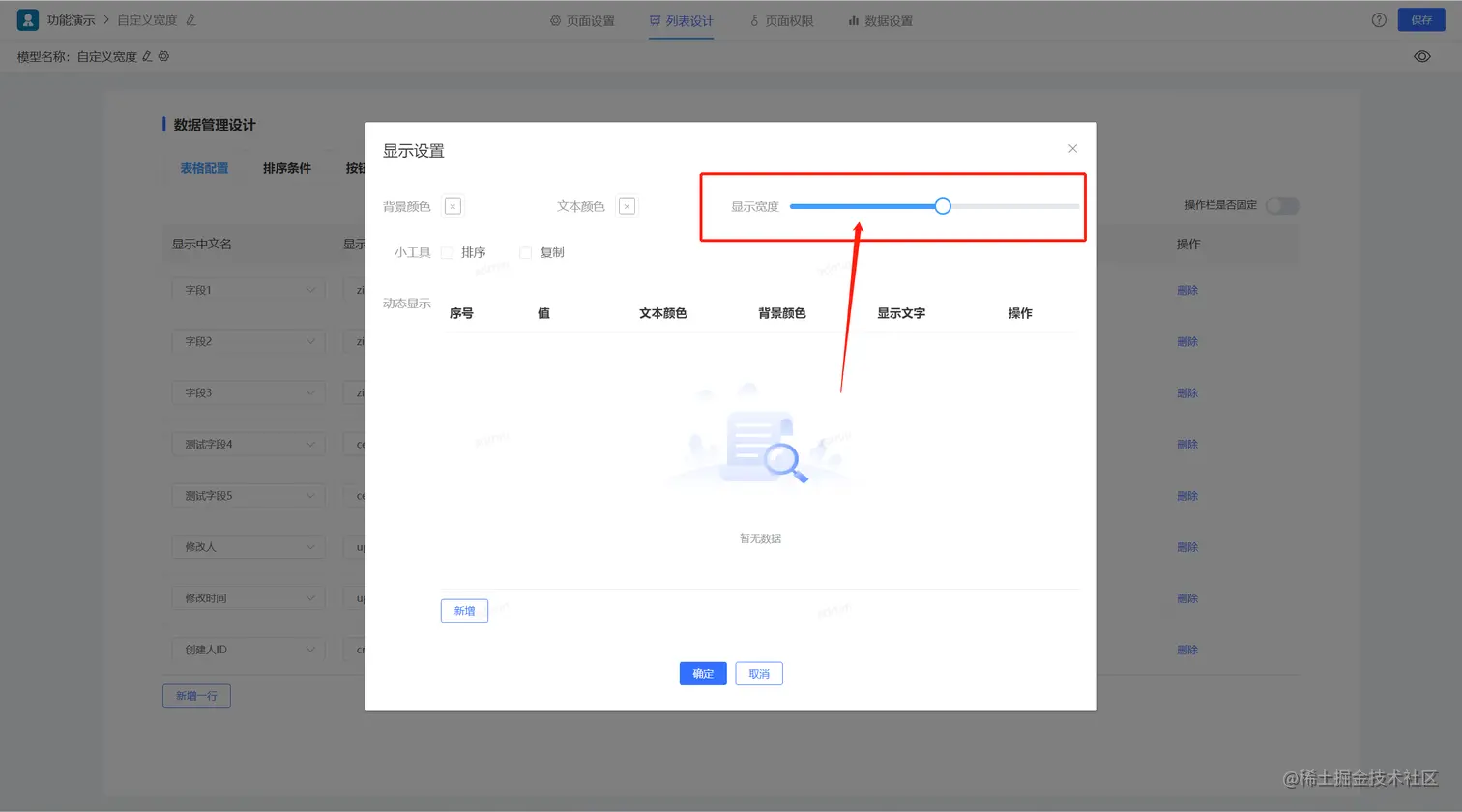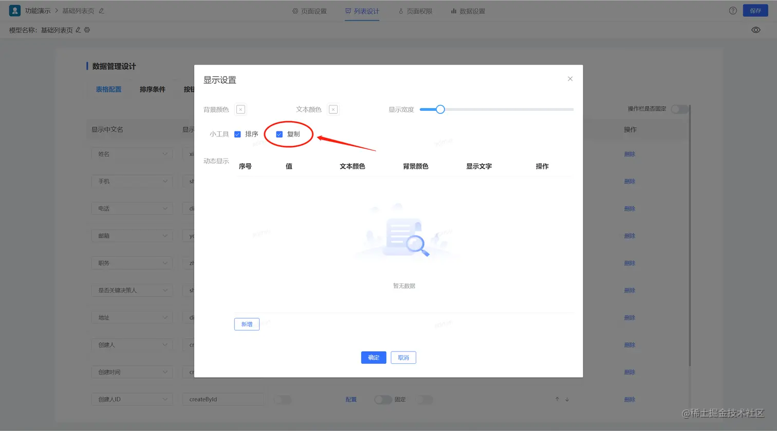 进入列表页的 数据配置界面,每个字段可以有独立的配置效果