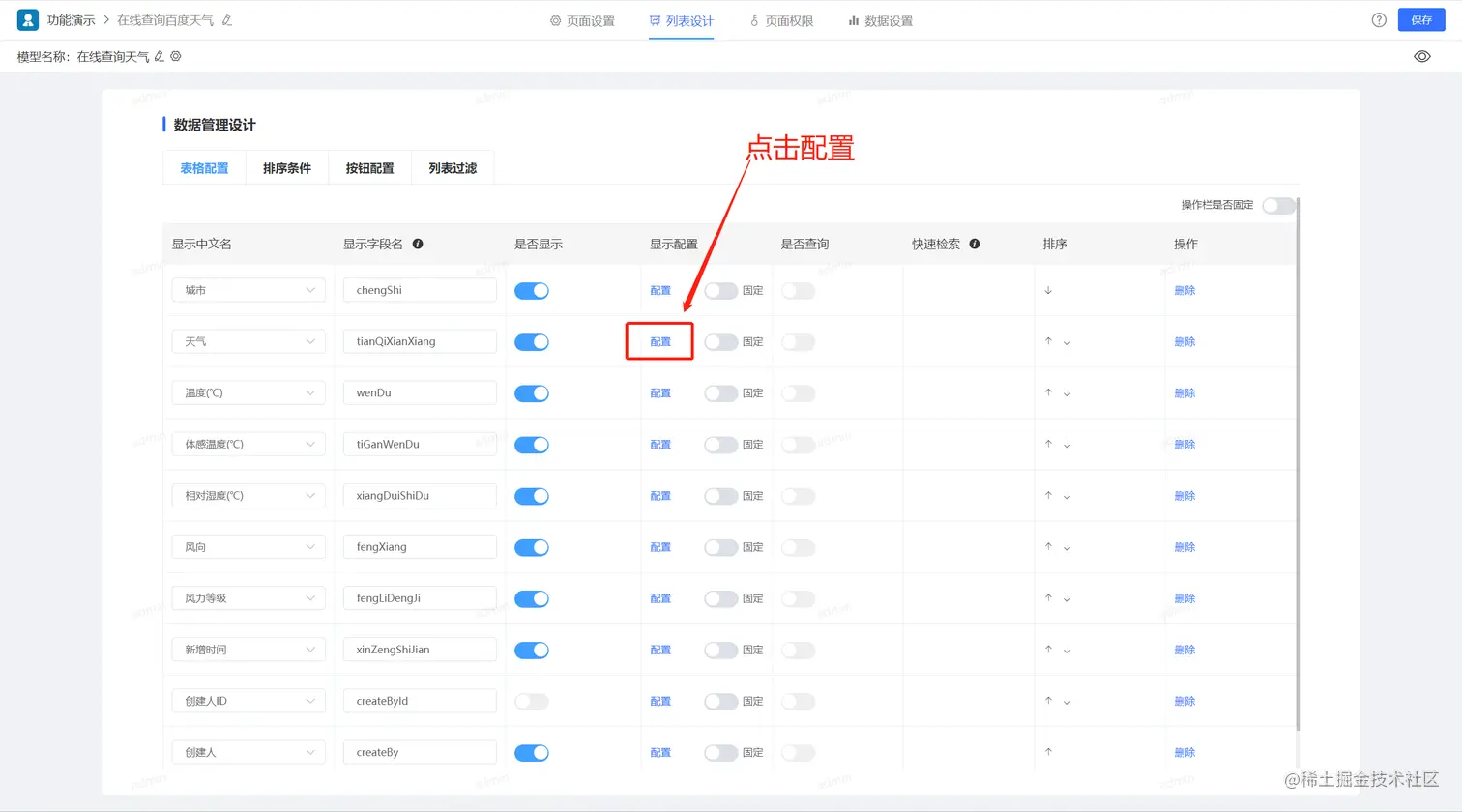 配置方式,在列表页的对应字段上,点击显示配置的 按钮