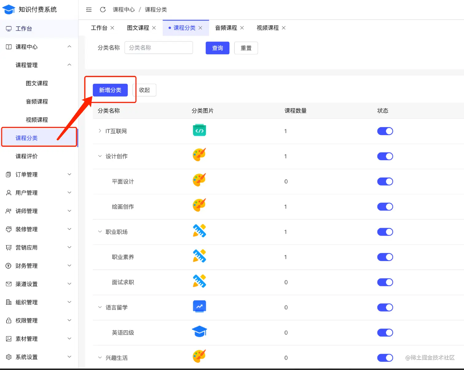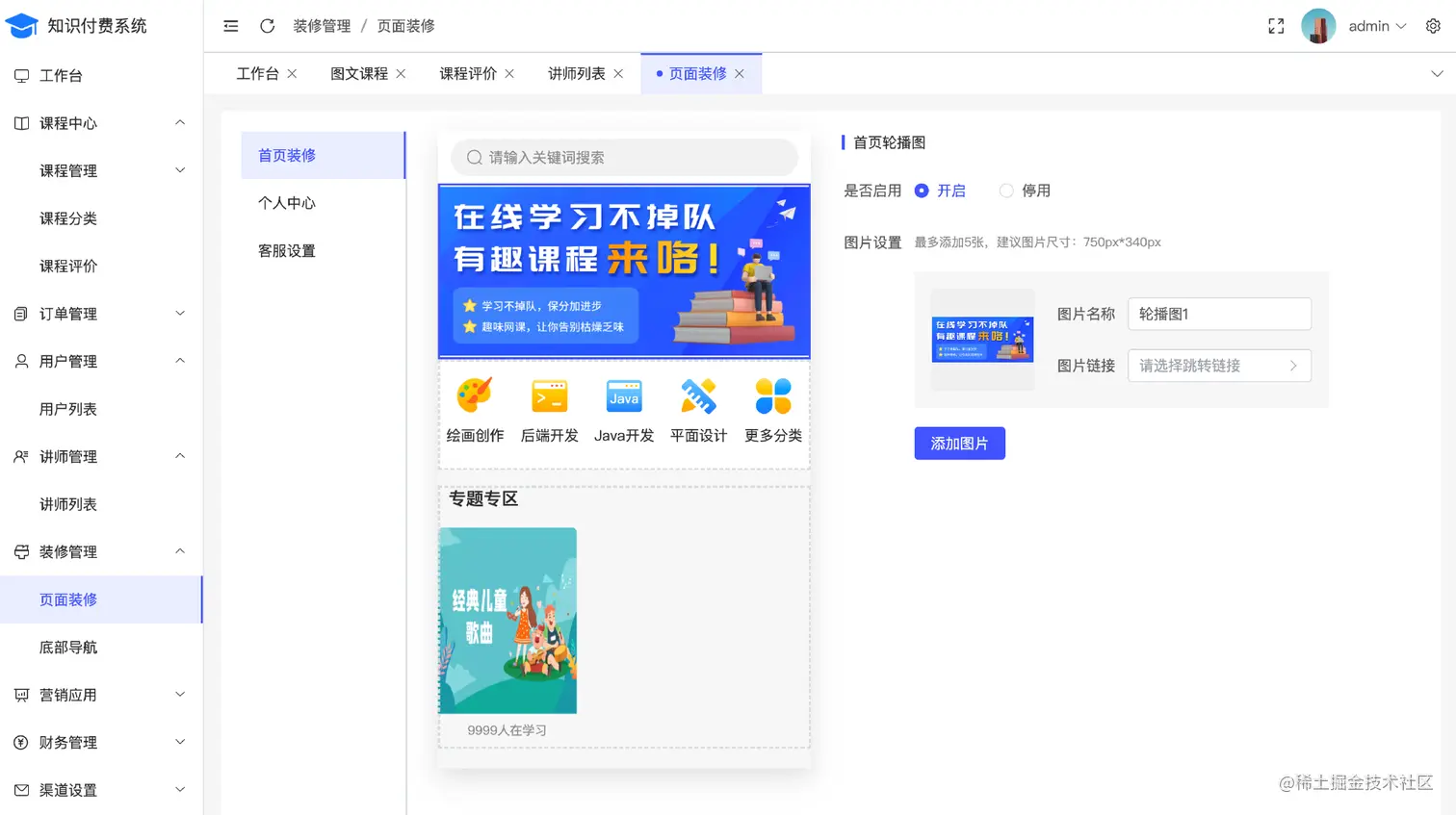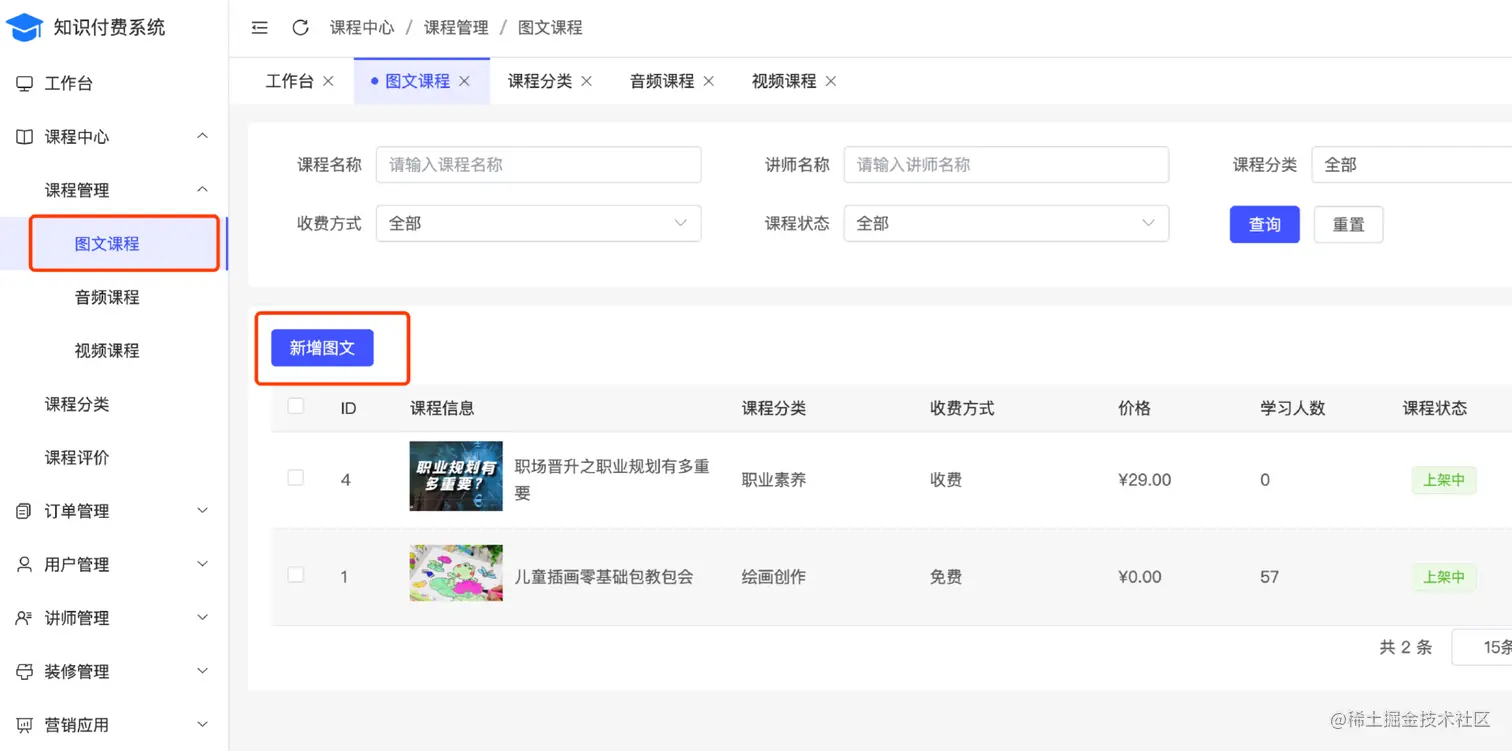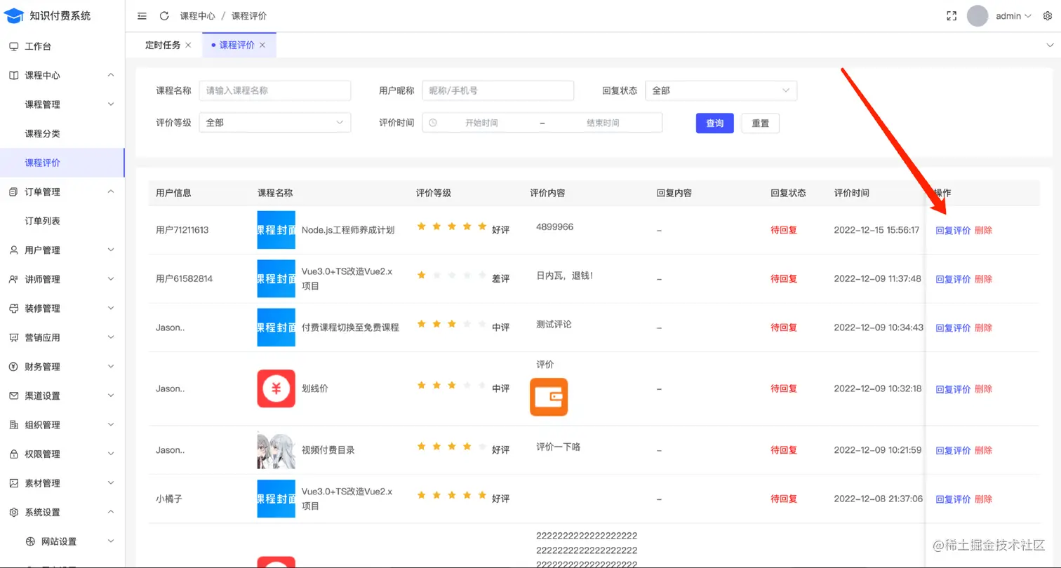 课程管理、分类和评价,可以新增、编辑和删除图文,新增课程分类,查看、回复课程评价等