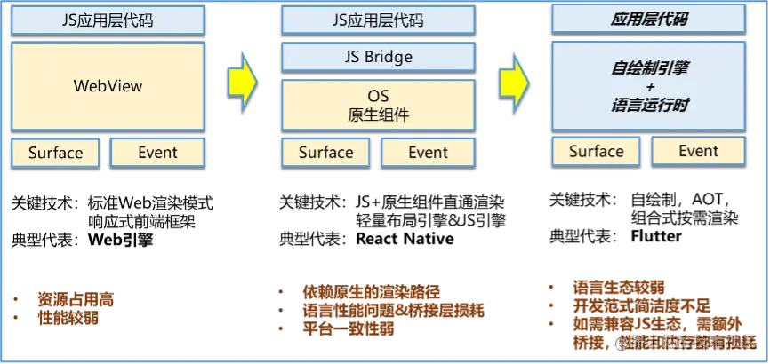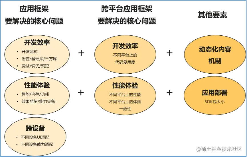 对同一OS平台而言,应用框架要解决的核心问题主要有三类:1.开发效率;2.性能体验;3.跨设备能力。