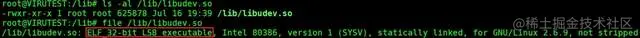 进入/lib目录,查看libudev.so文件表面上为库文件,使用file命令查看实际上是32位可执行文件,如图: