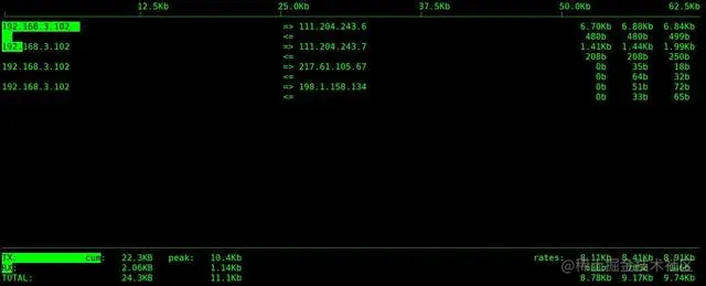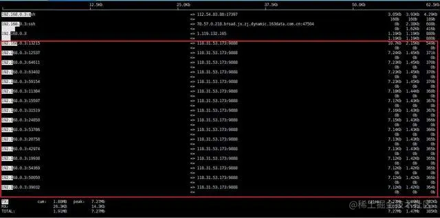 执行iftop命令可以看到对外异常连接明显减少,如图: