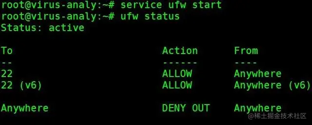 执行ufw status确认防火墙规则,如图: