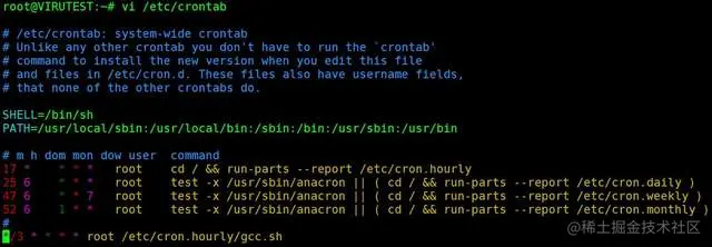 一般病毒都会通过编辑crontab使系统自动运行守护进程脚本,执行命令cat /etc/crontab,如图: