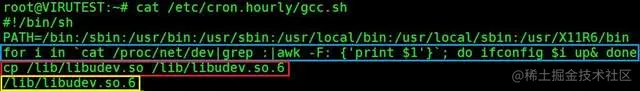 执行命令cat /etc/cron.hourly/gcc.sh查看脚本内容,如图: