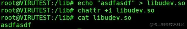 执行命令echo "asdfasdf" > libudev.so将libudev.so文件内容覆盖为asdfasdf,为防止守护进程再次修改文件,执行chattr +i libudev.so命令锁定该文件,禁止修改,如图,可以看到文件内容已被覆盖。