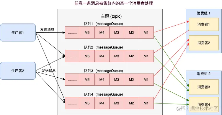 集群消费:同一 Topic 下的一条消息只会被同一消费组中的一个消费者消费。也就是说,消息被负载均衡到了同一个消费组的多个消费者实例上。