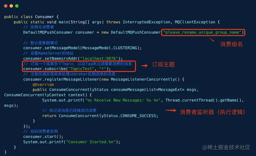 集群消费示例代码里,启动消费者,我们需要配置三个核心属性:消费组名、订阅主题、消息监听器,最后调用 start 方法启动。