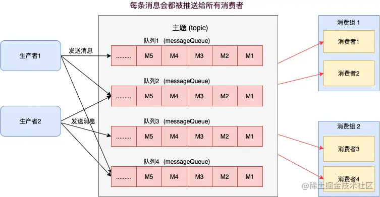 广播消费:当使用广播消费模式时,每条消息推送给集群内所有的消费者,保证消息至少被每个消费者消费一次。