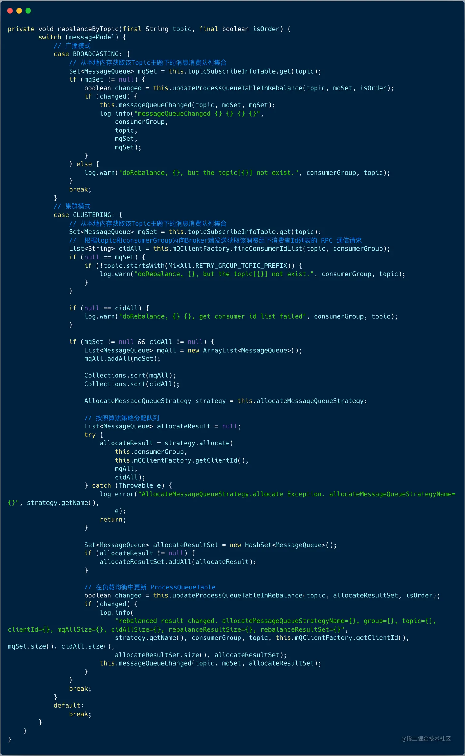 (3) 先对 Topic 下的消息消费队列、消费者 Id 排序,然后用消息队列分配策略算法(默认为:消息队列的平均分配算法),计算出待拉取的消息队列;