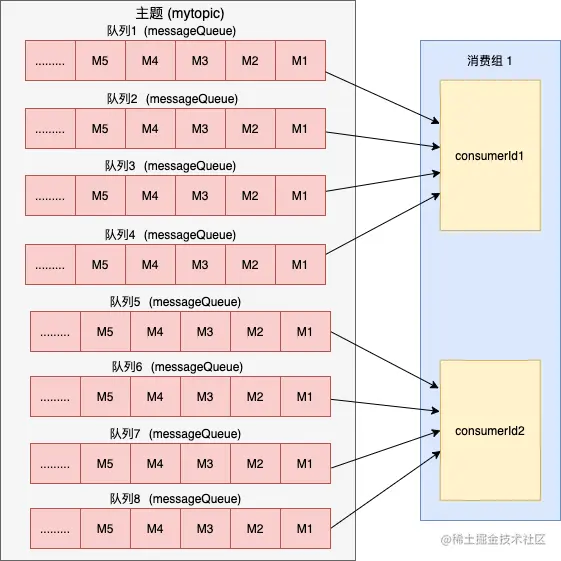 消费端的负载均衡是指将 Broker 端中多个队列按照某种算法分配给同一个消费组中的不同消费者。