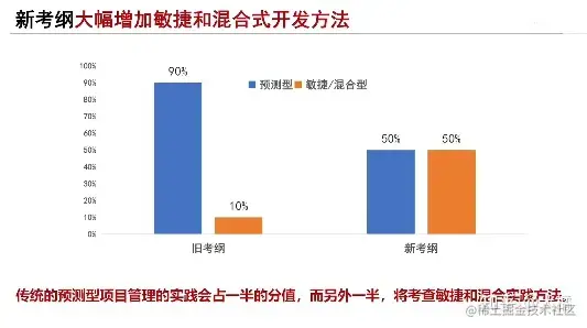 敏捷型方法的比重更大了,考纲强调要管理项目本身与商业环境 相互影响;敏捷宣言、原则和方法论成为了一个必选项;