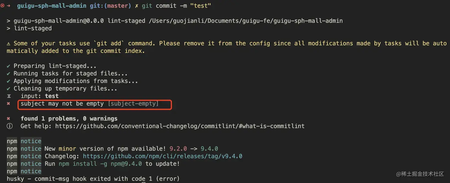当我们 commit 提交信息时,就不能再随意写了,必须是 git commit -m 'fix: xxx' 符合类型的才可以,需要注意的是类型的后面需要用英文的 :,并且冒号后面是需要空一格的,这个是不能省略的。不然就会像下面这样报错了: