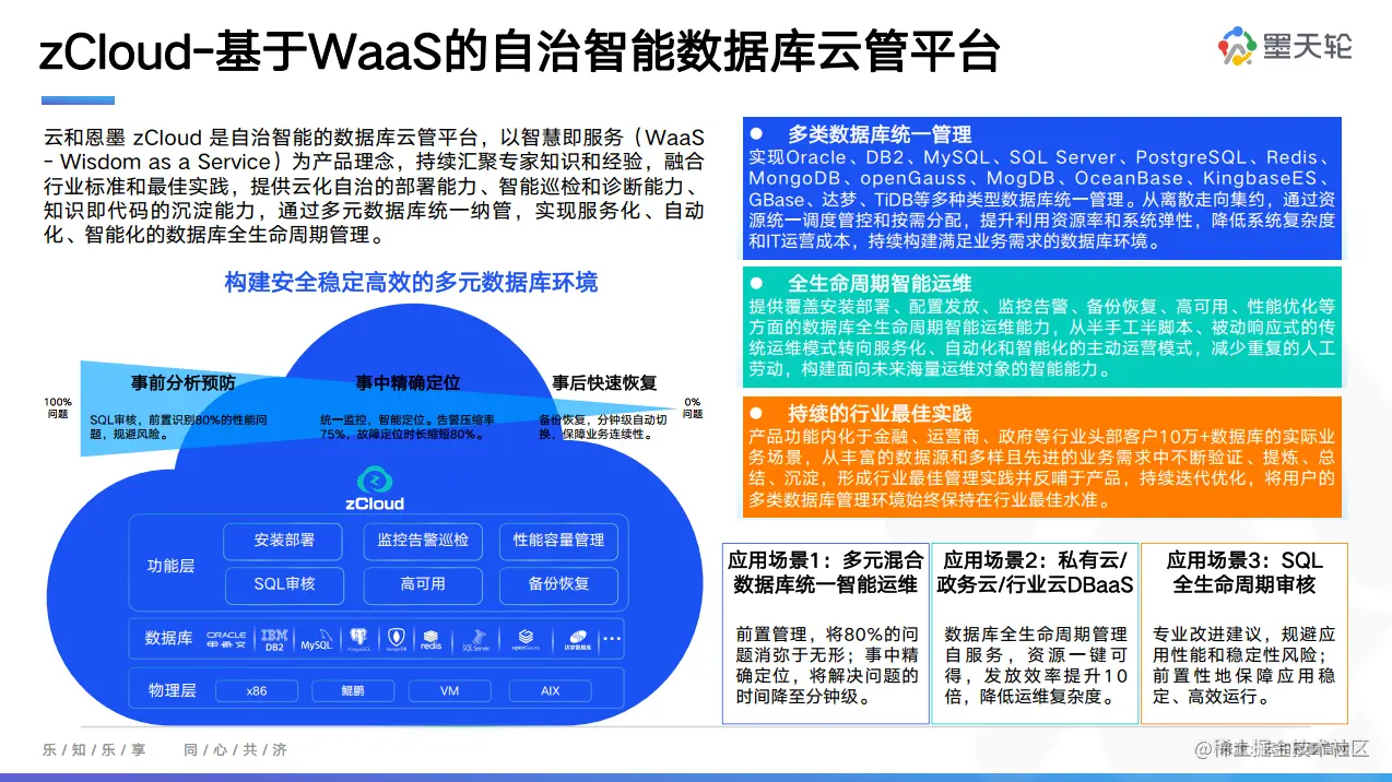 首先是智能运维与自治系统层面,介绍了数据库可观测性能力的作用、应用场景等,并对基于知识图谱的自动诊断路径进行解析,展示如何帮助运维人员提升工作效率。此外介绍了云和恩墨自治智能的数据库云管平台 zCloud 的功能与应用场景;新一代多云数据智能 SQL 管理平台 NineData 如何通过内置 AI 生成能力让用户直接通过自然语言提问及运维管理;openGauss AI4DB 的整体运维架构与应用功能展示。