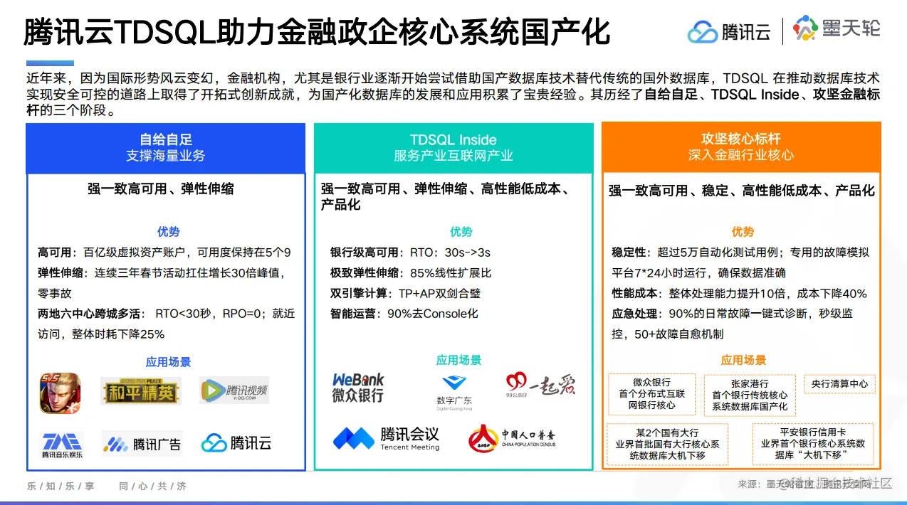 报告最后一章则选取了几款国内深耕不同领域且取得一定成绩的数据库产品案例进行了展示,诸如华为云 GaussDB、腾讯云 TDSQL、PingCAP TiDB、阿里云瑶池、金篆信科 GoldenDB、云和恩墨MogDB 以及科蓝 SUNDB 等,通过本章可以快速了解到这些数据库的应用场景、助力不同行业实现国产化落地实践的典型案例。此处仅展示其中几张内容,大家可以下载报告获取更多内容。